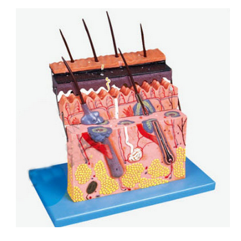 GD/A41002皮膚組織結構放大模型產品介紹:1、該模型由表皮和真皮各分兩部分共4個部件組成,借皮下組織與深層組織相連,并顯示表皮、真皮組織層次結構以及皮下組織和皮膚附屬器(包括毛、皮脂腺、汗腺和神...